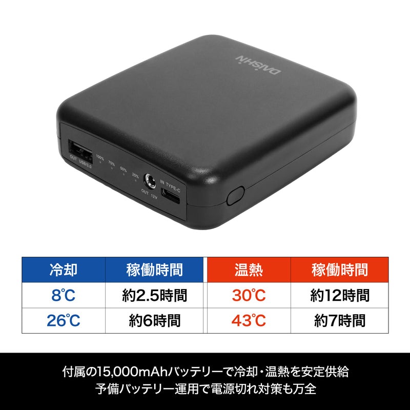 付属バッテリーには15,000mAhの大容量モデルを採用しているため、朝から夕方までの長時間の釣行などにも対応できそうだ。専用バッテリーがセットになっているので、すぐに使えるほか、予備バッテリーも合わせて使えば一日中快適に釣りやキャンプが楽しめるはず。