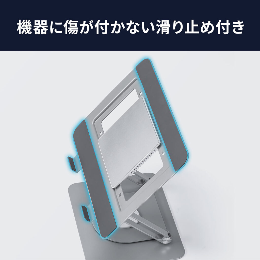 また、最大17.3インチまでのノートPCやタブレットに対応する本製品は、約2.3kgの安定感ある構造で、大型端末もぐらつかずにしっかりと支えてくれる。滑り止めストッパーも装備されており、機器の落下を防止する安全設計も心強い。