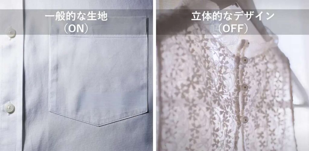 吸着機能はON/OFFの切り替えが可能で、一般的な綿やポリエステル素材の衣類はON、フリルやプリーツが入った部分はOFFというように、素材や部位に応じた柔軟な使い方ができる点も嬉しいポイント。