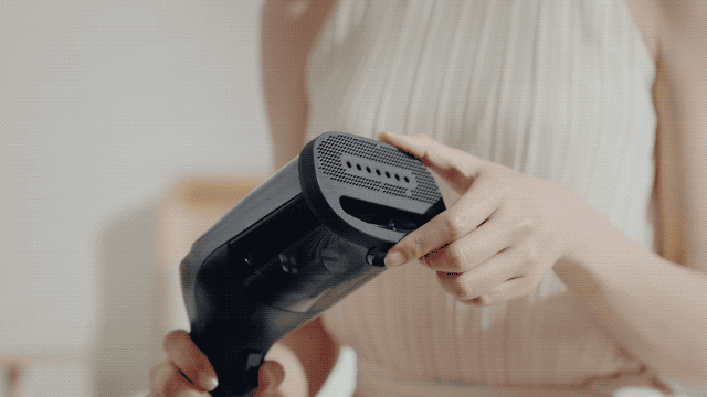 「Morus V3」最大の特徴は、布地にピタッと吸い付く吸着機能。この機能により、一般的な衣類スチーマーのように布地を引っ張る必要がなく、片手での操作が可能になる。