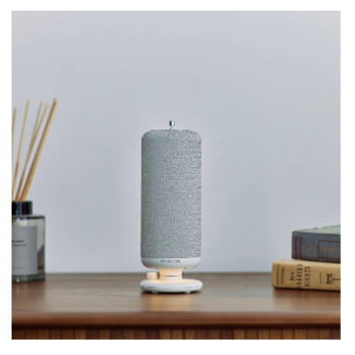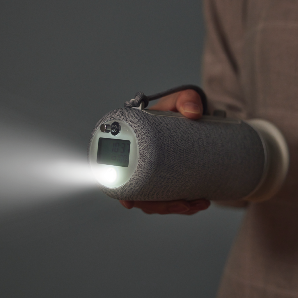 また、筐体下部のソフトライトをつければあたたかな暖色の光が部屋を優しく照らし、くつろぎの空間を演出する。リビングや寝室はもちろん、アウトドアでも活躍するデザインだ。