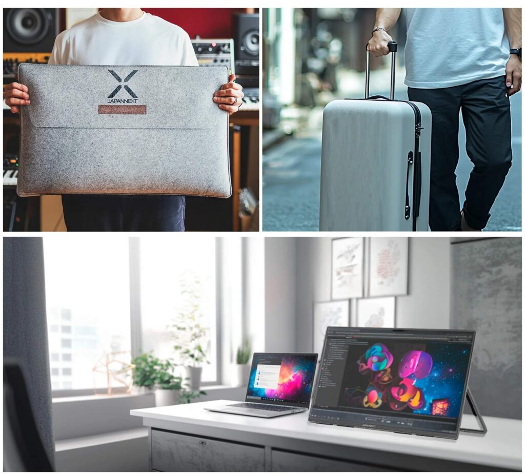 大型ディスプレイでありながら、奥行わずか16mmの薄型設計で持ち運びにも便利だ。付属のフェルトケースは、ディスプレイ本体をホコリや傷から守り、持ち運び時の保護に最適だ。