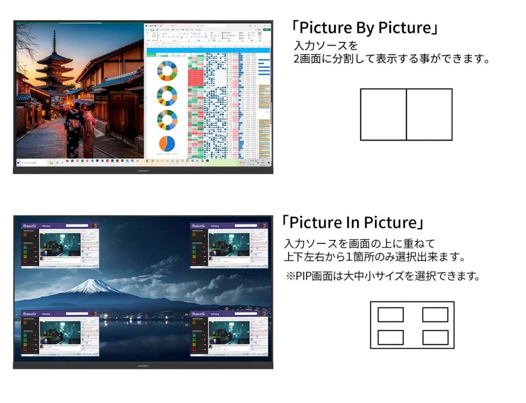 また、入力の一つを子画面として表示する「PIP(Picture in Picture)」機能も搭載。Web会議をしながら資料を確認するなど、複数のタスクを同時にこなす場面で活躍する。