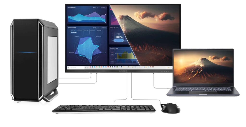 さらに、KVM機能を搭載しているため、モニターに接続したキーボードとマウスをデスクトップPCとUSB-C接続のノートPC間で簡単に切り替えて使用できる。複数のPCを行き来する作業環境でも、入力デバイスの付け替えが不要で、作業効率を高められるだろう。