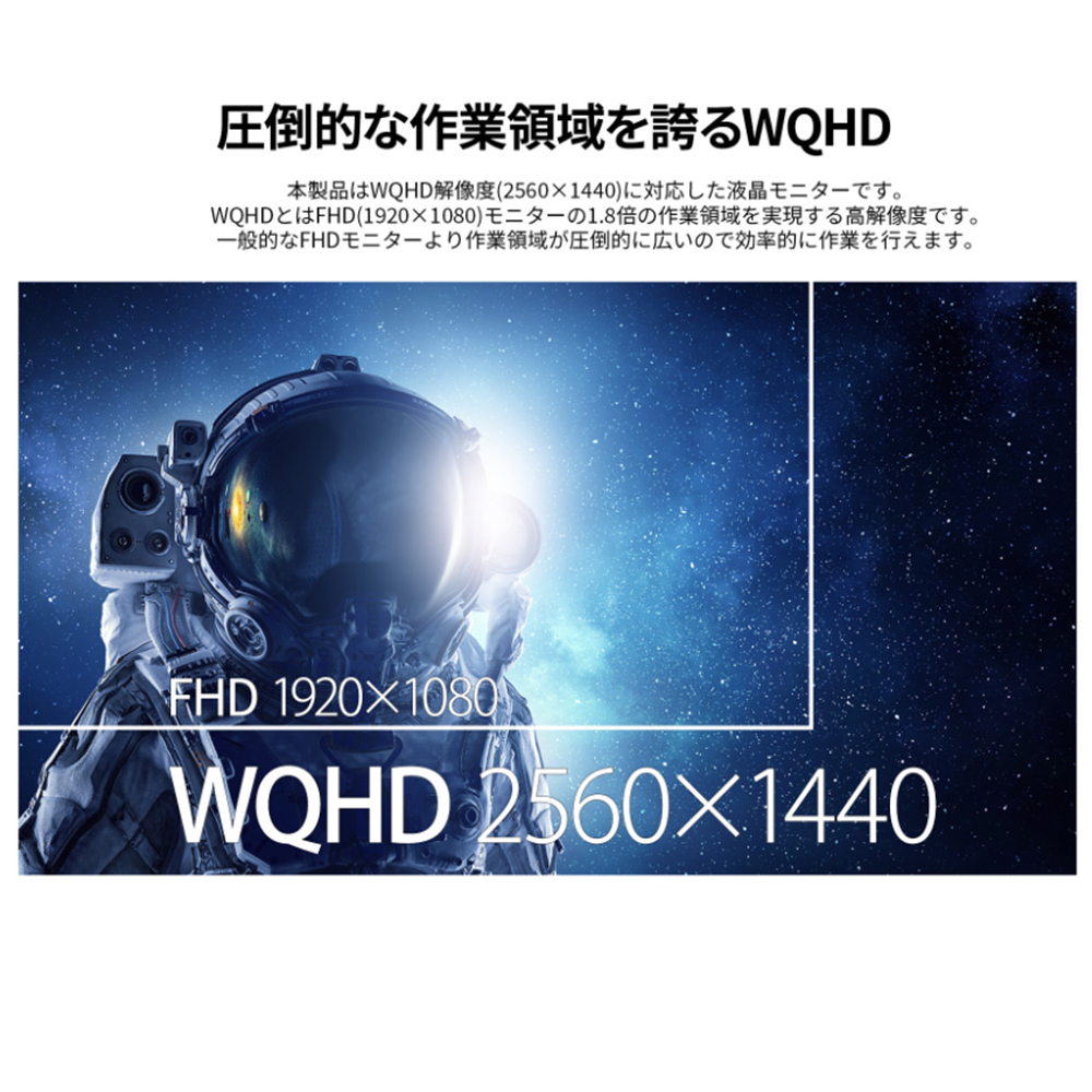 「JN-i27G300Q」は、WQHD(2560×1440)解像度を採用。フルHD(1920×1080)と比較して約78%多い画素数により、より精細で鮮明な映像表示を実現する。特にオープンワールドゲームやRPGなど、広大なマップや細かいテキストが多いゲームではその差は歴然だろう。