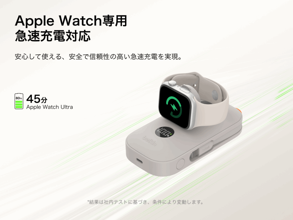 本製品は、Apple Watchユーザーが外出先で直面する「専用充電器の持ち運びの煩わしさ」という課題に正面から取り組んだ製品だ。Apple Watch用の急速充電モジュールを本体に内蔵することで、45分でApple Watchを0〜80%まで充電できる。