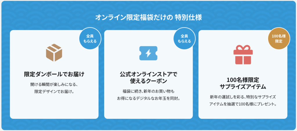公式オンラインストア限定福袋と、直営店舗限定オリジナル福袋がそれぞれ発売されるとのこと。