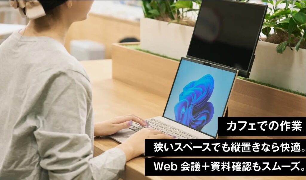「WING BINDER」の最大の特徴は、横幅を取らずに縦方向に画面領域を拡張できる点にある。横置きのマルチモニター設置では、かなりの卓上スペースが必要だったが、このスタンドならノートPCの真上にモニターを配置できるため、狭いカフェのテーブルや新幹線の座席テーブルでも快適に作業が可能だ。