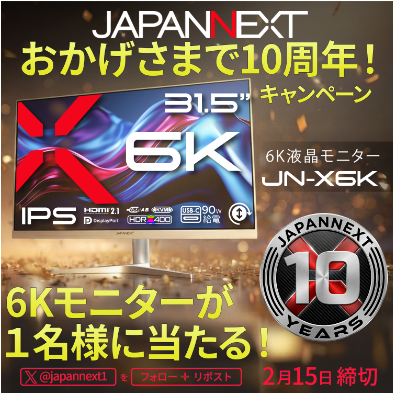 JAPANNEXTは創業10周年を記念して、「おかげさまで10周年。6Kモニタープレゼントキャンペーン」を実施する。6Kモニター「JN-X6K」を1名にプレゼントするという太っ腹企画。2025年9月の製品発表会で参考展示していた6Kモニターを製品化し、2026年2月に発売することが決定したとのこと。